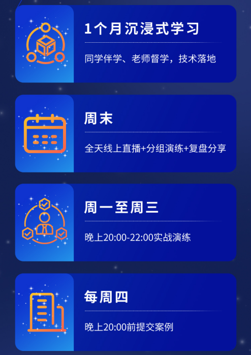 周一至周四:小组训练,包含作业提交、案例报告撰写等丰富内容,全面提升实战能力。