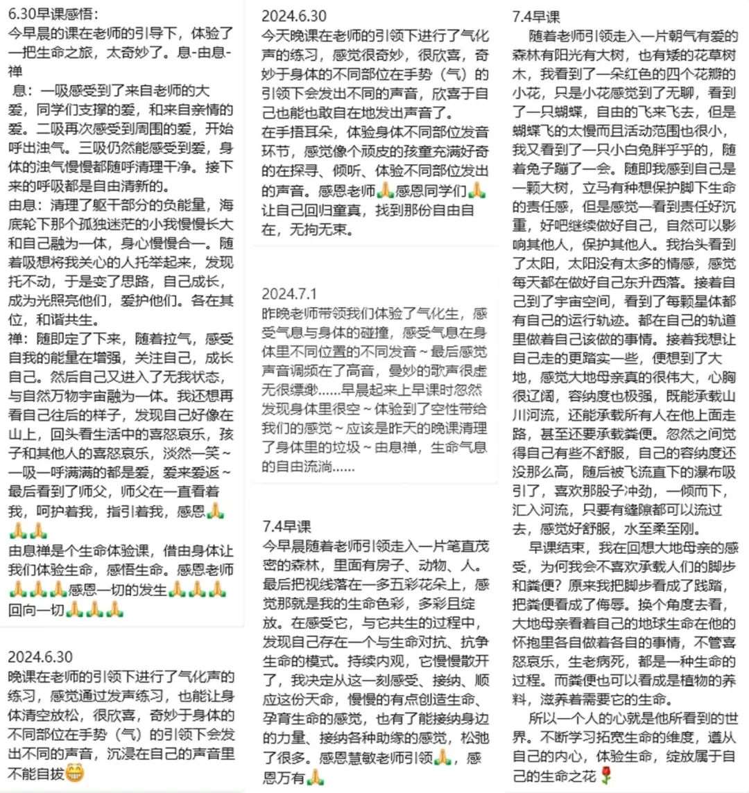 《由息禅》课程已进行了十二轮,学员们反馈,每天都会有意想不到的惊喜。这是往期课程部分学员的分享: